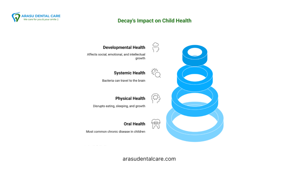- Bad decay disrupts eating and sleeping patterns and can slow growth