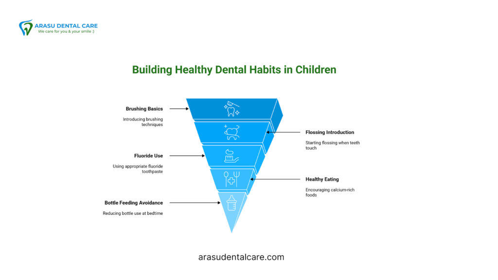 Good oral health starts with daily care habits. Begin brushing when you spot that first tooth, and use the right amount of fluoride toothpaste for your child’s age. Healthy food choices help keep teeth strong. Note that nighttime bottles should only contain water to prevent decay.